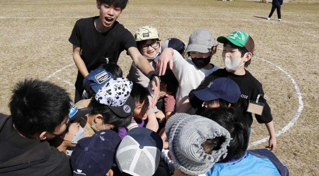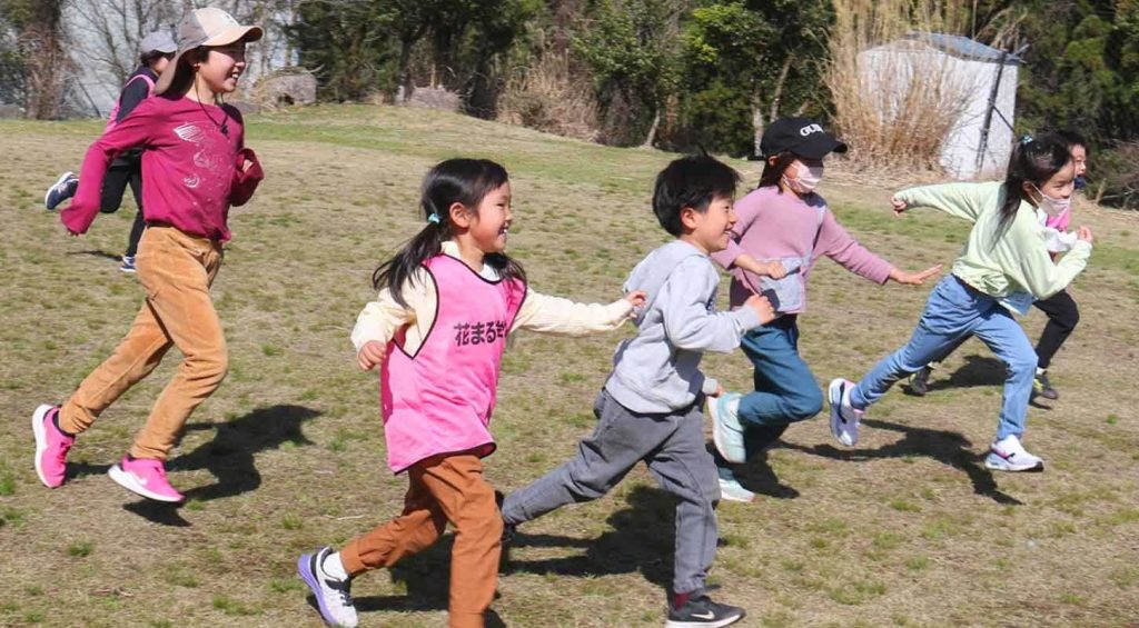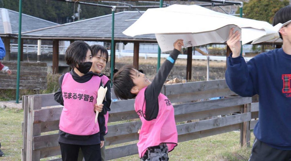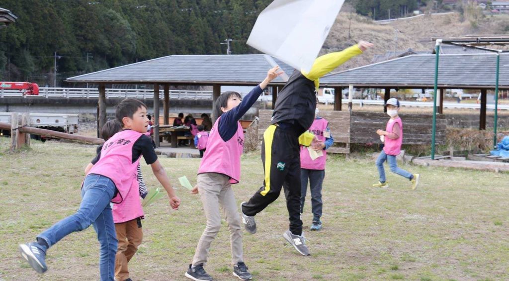 午前の活動は「巨大紙飛行機飛ばし」。「投げ方を変えたらもっと飛ぶんじゃない?」それぞれ感じたことを言葉にしながら、どうしたら飛距離を伸ばせるかを考えました。その後、リレーの順番決めをおこないました。「2回走る人は誰にする?」という問いかけに「足が速い人」とみんな答えました。「でもそれぞれの足の速さを知らないよね?」「じゃあ、走ってみればいいじゃん!」と子どもたちからナイスアイデアが。みんなで頭と心を使いながら「みんなで」リレーの順番を決めました。